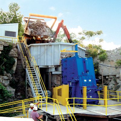 Large rock or run-of-mine material is dropped into the wide feed opening and falls into the crushing chamber by gravity.